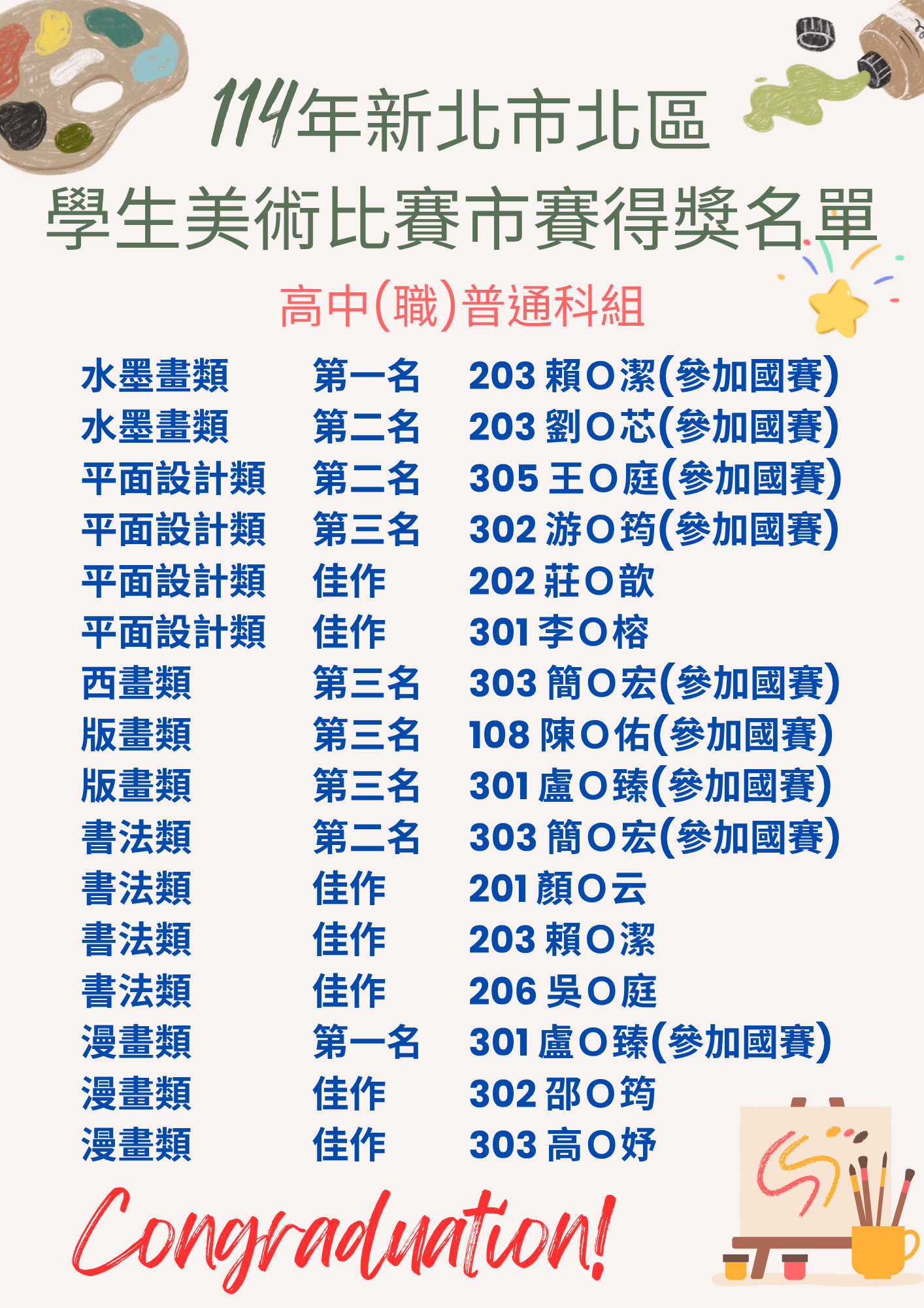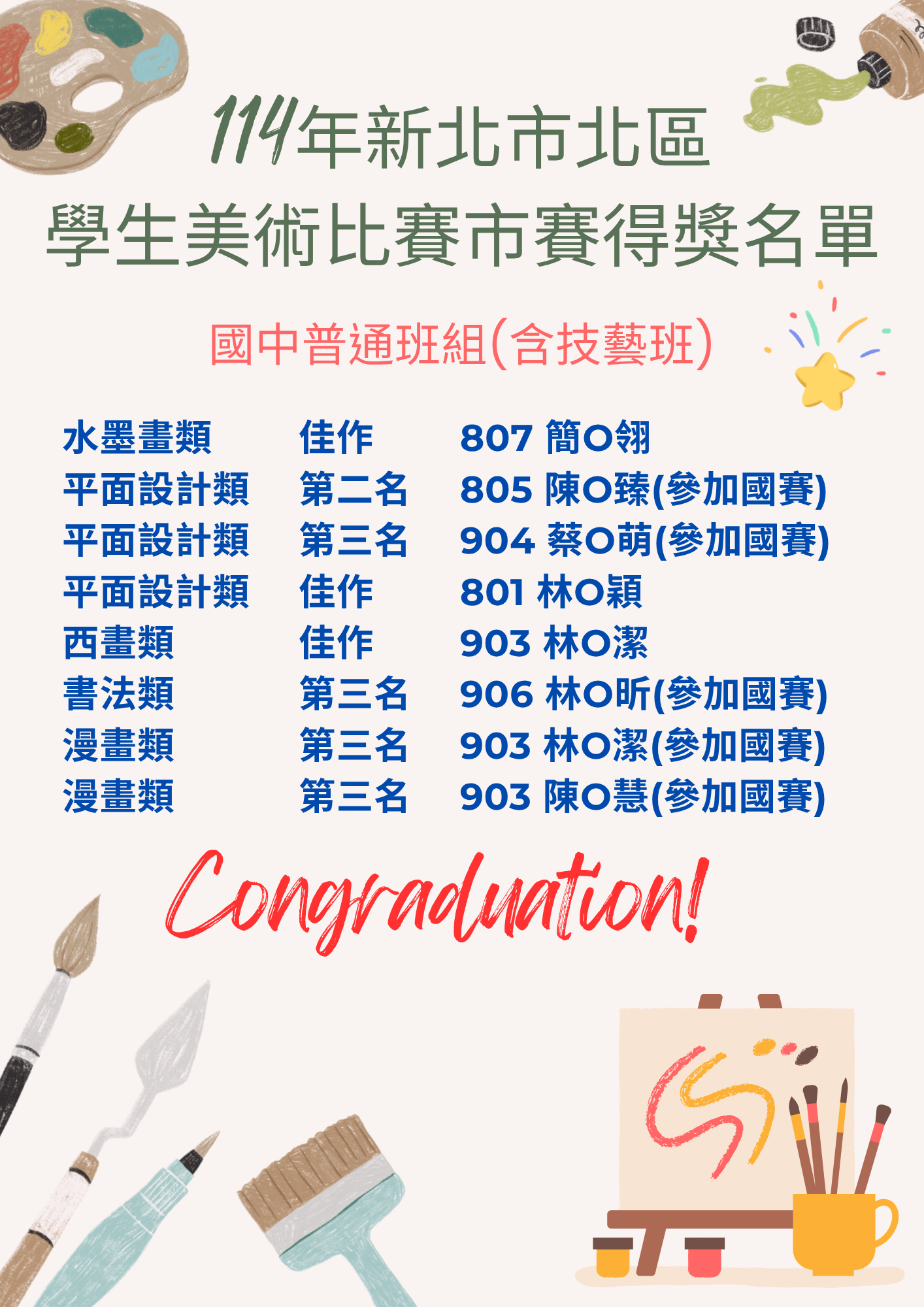 狂賀!!本校參加114學年度新北市市賽美術比賽榮獲佳績